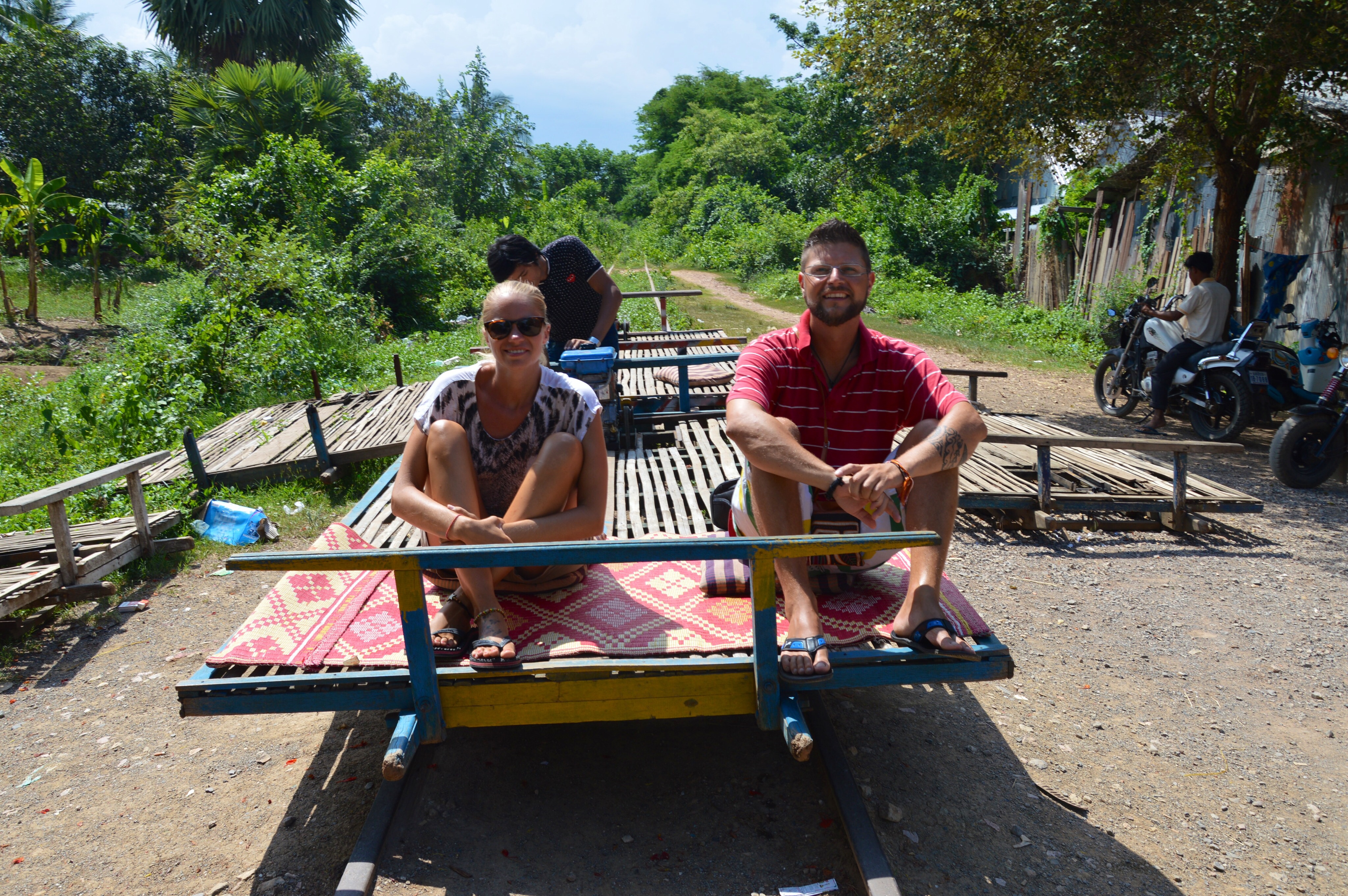 The bamboo train is one of the world’s all-time classic rail journeys. 3,7 km – half an hour – 15 km/h of clicks and clacks along warped, misaligned rails. Each bamboo train consists of a 3 m long wood frame, covered with bamboo, that rests on two barbell-like bogies, the aft one connected by fan belts to a gasoline engine.