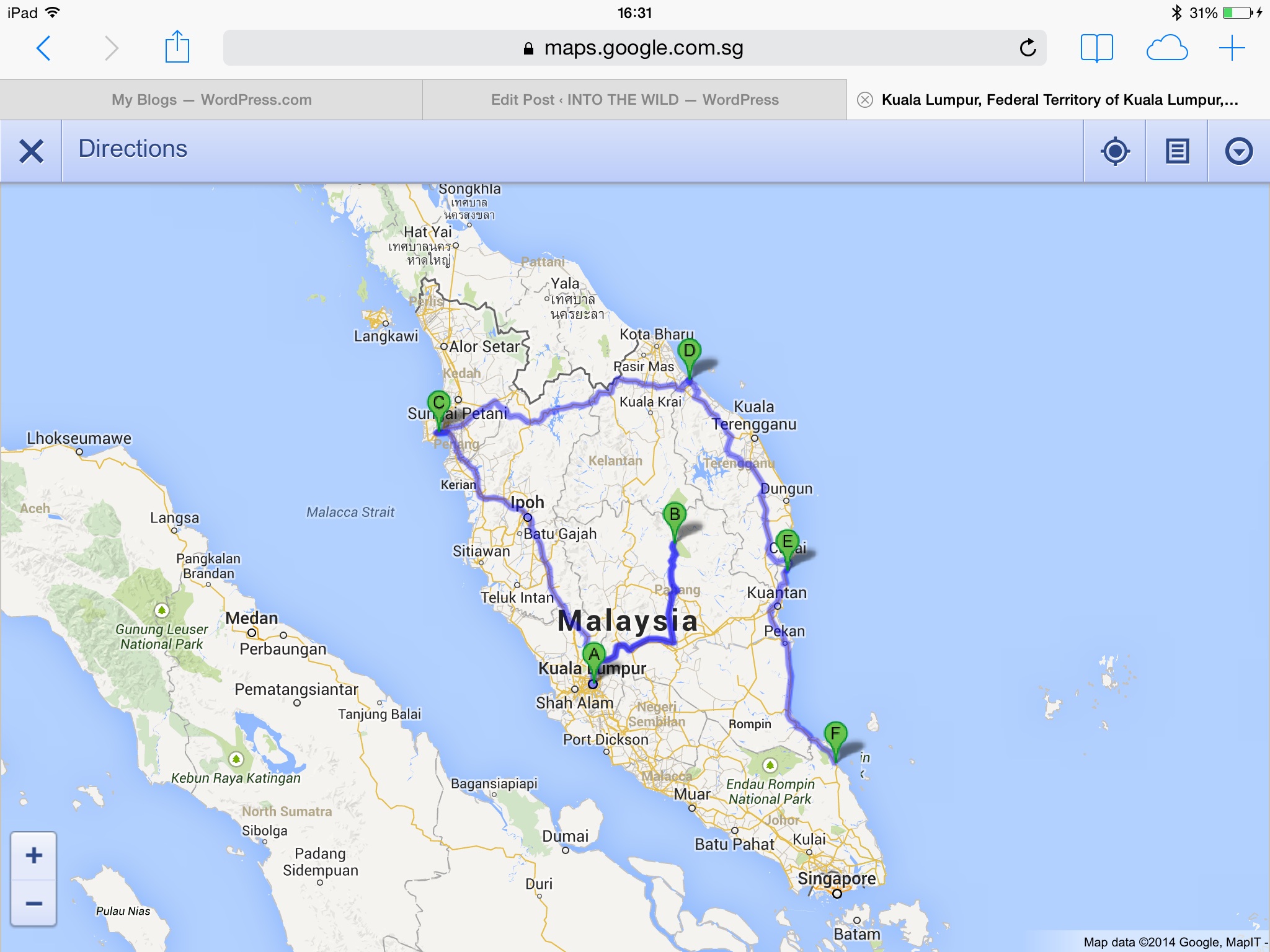 The road, rivers and the sea took us 1800 km, starting in Kuala Lumpur (point A – 3 h plane ride from Chiang Mai/Thailand) to national park Taman Negara (point B – 4h bus + 3h boat ride on the river). After taste of the jungle we stopped at UNESCO heritage town George Town (point C – due to the Ramadan holidays it took us 15 h with several buses). And in the end it was time for a 1,5 week of beaches at the Perhentian Island (point D – 5 h bus drive and 1 h boat ride), cute coastal town Cherating (point E – 6 h bus drive) and last but not least Tioman Island (point E – 3 h of taxi and 2 h of boat ride).
