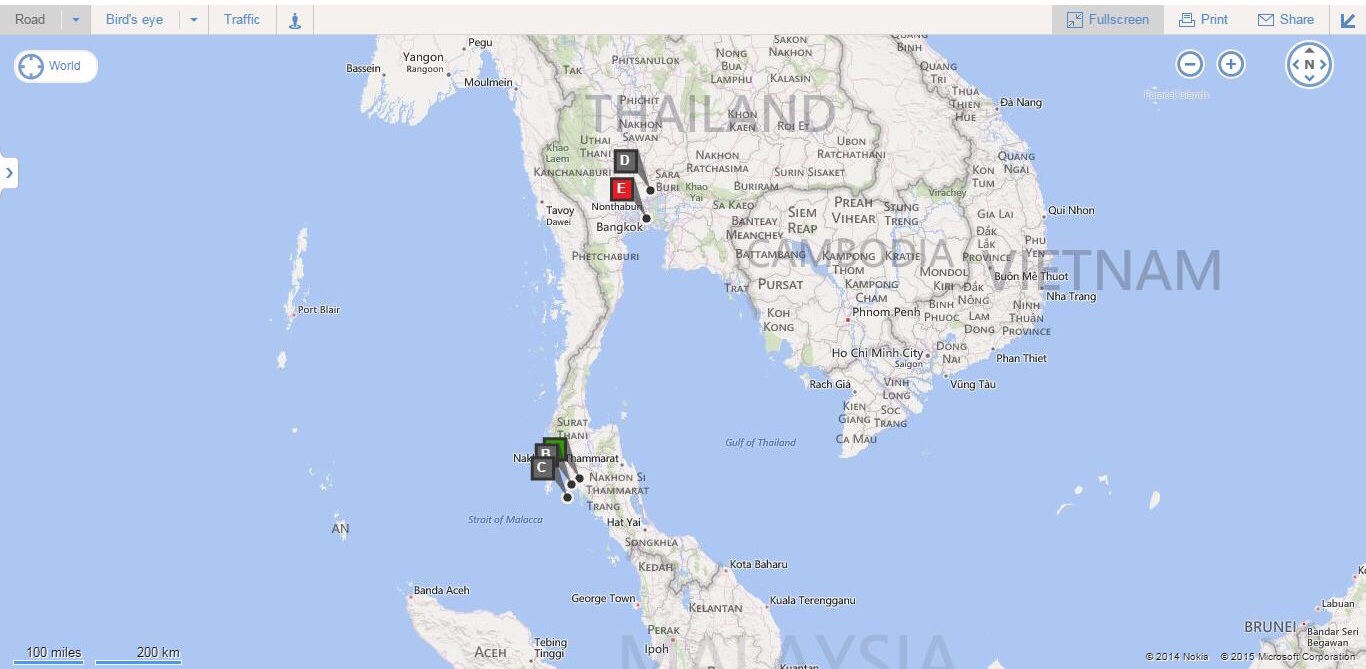 The last two weeks route covers around 1100 km starting in Krabi (point A), following 20km and 40min by boat to Railay (point B), next 2 hours by boat to Ko Phi Phi (point C), then about 900km and 20 hours by boat, bus and train to Ayutthaya (point D) and finishing in Bangkok (point E) after 90km and 2 hours train ride.